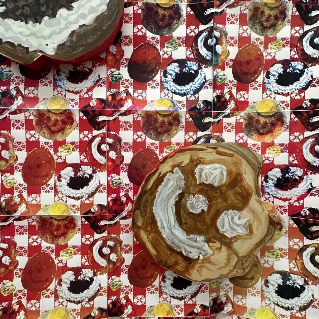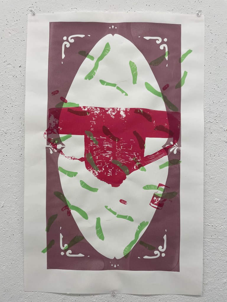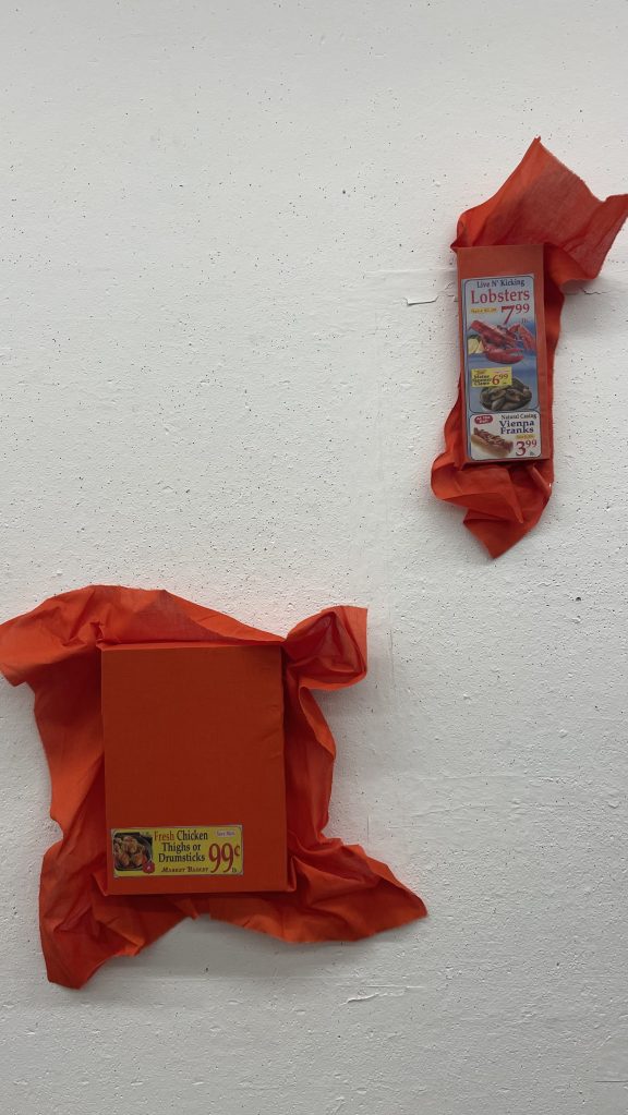 Acrylic on insulation board, CMYK screen print on paper, screen print on bedsheet.