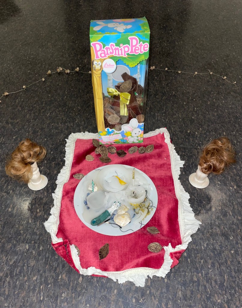 Found object, clover, candles, thread, upholstery fabric, bedsheets, hair.